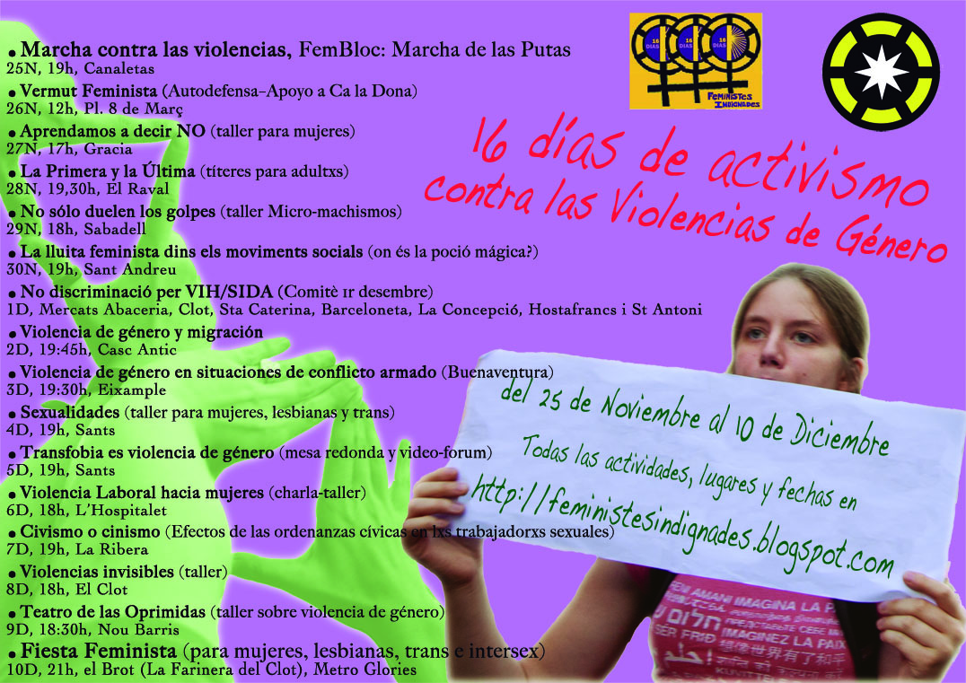 Feministes Indignades (Barcelona), nos sumamos a esta convocatoria y realizaremos cada día una acción (manifestación, charlas, teatro, videoforums, talleres… y hasta una fiesta!) para visibilizar los diferentes tipos de violencias de género.